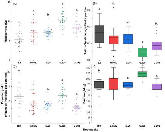 The rootstocks demonstrated differences in vigor as expected. The trunk cross-sectional area (TCSA) by the end of the 2021 growing season was 7.22 ± 0.35 cm2 in the G.935, 7.21 ± 0.40 cm2 in G.202; 5.50 ± 0.41 cm2 in M.9, 5.38 ± 0.25 cm2 in M.26, and 4.14 ± 0.22 cm2 in B.9 (mean ± standard error; data not graphed). More vigorous rootstocks resulted in a higher yield per tree, with large-dwarfing G.935 being the most productive, followed by large-dwarfing G.202 and moderate-dwarfing M.26 and M.9; ‘Ambrosia’ on small-dwarfing B.9 had the lowest yield per tree (Figure 7A). The ratio of heat-damaged fruits was on average 5% in G.935, significantly lower than that in the smaller-dwarfing rootstocks M.26, M.9, and B.9 (Figure 7B). B.9 and G.935 excelled the other three rootstocks in the projected yield of damage-free fruits per acre based on the estimated optimum planting density for each rootstock (Figure 7C). G.935 led to the highest average fruit weight (Figure 7D).