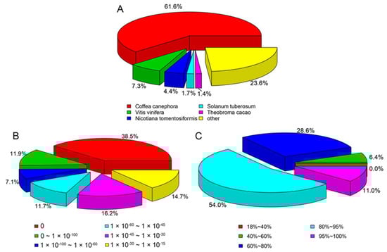 According to the species classification from the result of BLAST with Nr (Figure 1A), Coffea canephora (Rubiaceae, Coffea) had the highest matching rate, followed by Vitis vinifera (Vitaceae, Vitis), with the next highest being Nicotiana tomentosiformis (Solanaceae, Nicotiana). As can be seen from Figure 1B, 38.5% of the unigenes can be fully matched to Nr (the smaller the E-value, the higher the degree of matching and the similarity), and the degree of matching in Nr is relatively high. Figure 1C shows that 11.0% of the unigenes had more than 95% similarity, and 54% of the unigenes had 80–95% similarity (the higher the similarity, the higher the confidence).