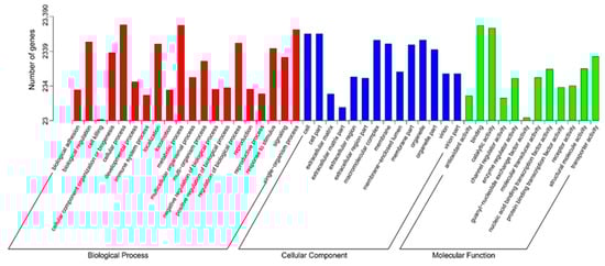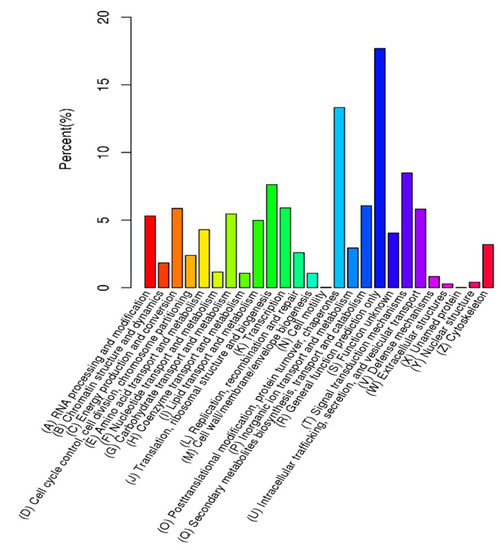 Transcriptome sequencing was carried using an Illumina HiSeq 4000 platform (Beijing Novogene Biological Information Technology Co., Ltd., Beijing, China); clean reads were used for de novo assembly using Trinity (version: trinityrnaseq-r20131110) with the default parameters to obtain transcripts, and TGICL version 2.1 software was used to cluster the transcripts into unigenes [48,49]. For functional prediction and classification, all unigenes were compared against public databases, including NCBI non-redundant protein sequences (Nr), Nt, Protein Family (Pfam), Eukaryotic Orthologous Groups of Proteins (KOG/COG), Swiss-Prot, the KEGG Orthology database (KO), and Gene Ontology (GO). BLAST [50] was used for unigene annotation in the Nt, Nr, COG, and Swiss-Prot databases. The KEGG Automatic Annotation Server [51] was used for KEGG annotation of unigenes. Blast2GO [52] and Nr annotation results were used for the GO annotation.