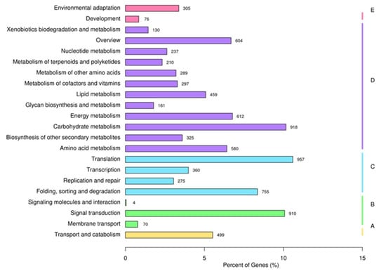 KEGG metabolic pathways of assembled unigenes of the L. yunnanensis flower transcriptome: (A) cellular processes; (B) environmental information processing; (C) genetic information processing; (D) metabolism; (E) organismal systems. The x-axis indicates the number of genes in each metabolic pathway and the ratios of the number of genes to total number of annotated genes; the y-axis indicates the names of the KEGG metabolic pathways.