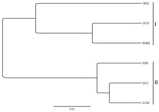 A total of 9195 primer pairs were designed using Primer 3.0, and 81 primer pairs were randomly selected to amplify across the genomic DNA template of L. yunnanensis. Of the 81 primer pairs, 44 of them successfully amplified fragments from L. yunnanensis genomic DNA, with a success rate of 54.32%. Therefore, the primers developed and designed in this study have a certain applicability to the population of L. yunnanensis. According to the preliminary screening results, 10 individuals were randomly selected from each population (a total of 60 individuals from 6 populations) to further verify the polymorphism of the 44 primer pairs that could amplify bands. Among them, 17 primer pairs were found to be polymorphic in L. yunnanensis, producing clear amplicons of the expected size, which were suitable for the detection of SSR loci by capillary electrophoresis. The specific information of 17 EST-SSR primers is shown in Table 5. A dendrogram clustered the 6 populations of L. yunnanensis into 2 clusters (Figure 5). One cluster (I) included 2 populations (GDX and GCG) of Gongshan County and one population (FMM) of Fugong County. The other cluster (II) included 2 populations (LCM and LLO) of Lushui County and one population (FPK) of Fugong County. Geographically, FMM is close to Gongshan County and FPK is close to Lushui County, which is consistent with the results of cluster analysis.