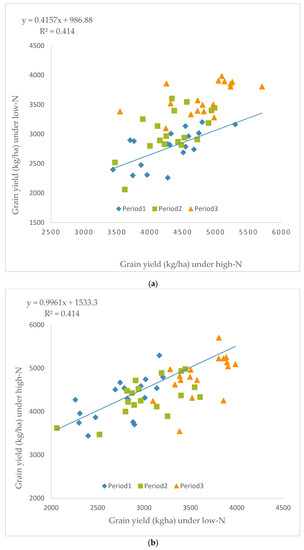 Comparative performance of early-maturing maize hybrids of the three breeding periods in low and high N environments. Regression of (a) grain yield of low N on grain yield of high N and (b) grain yield of high N on grain yield of low N conditions.