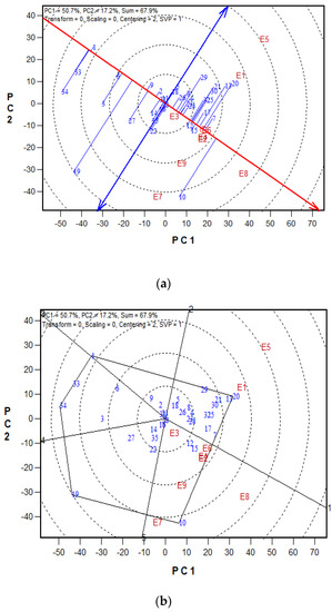 - Yan, W. GGE biplot: A Windows application for graphical analysis of multi-environment trial data and other types of two-way data. J. Agron. 2001, 93, 1111–1118. [Google Scholar] [CrossRef] [Green Version]