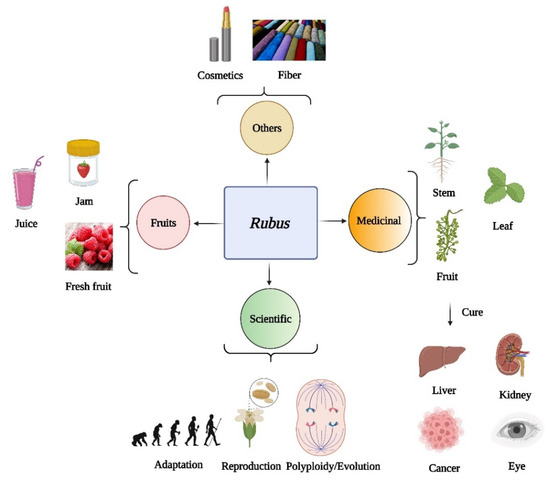 Figure 1. Different aspects of Rubus species utilization. The attributes of Rubus are primarily utilized for applications involving fruit (fresh fruit, jam, and juice), medicinal compounds (fruit, leaf, and stem), and scientific studies (adaptation, reproduction, polyploidy, and evolution). In addition, among the wild Rubus species, some can also be used to produce cosmetics or fiber products. This figure was created using BioRender software.