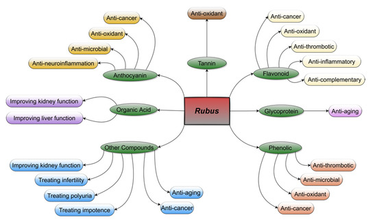 Figure 2. Schematic description of the secondary metabolites of Rubus and their medicinal benefits to humans. The central red rectangle represents the wild Rubus species, the seven green ellipses represent the major secondary metabolites of Rubus, and the outermost ellipses represent the main medicinal functions of secondary metabolites. The various colors show different effects on human health.