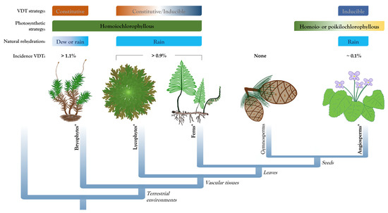 During the early evolution of land plants, primitive plants evolved mechanisms of DT that allowed them to survive increasingly longer periods of dryness in terrestrial ecosystems. Therefore, the acquisition of DT was crucial for the colonization of land environments [6]. These primitive plants probably possessed constitutive protection mechanisms coupled with an active cellular repair process, similar to those observed in many desiccation-tolerant bryophytes [7]. A constitutive protection strategy is inferred from the fact that some bryophytes can survive rapid water loss, even when desiccation is reached in a few minutes [6,8]. This DT strategy involves the constitutive expression of genes involved in cellular protection, and the constant presence of proteins, enzymes, and metabolites is required to tolerate desiccation. Constitutive mechanisms for DT have an implicit fitness cost caused by the constant production of protective components and compounds required for DT. Although it is generally accepted that desiccation-tolerant bryophytes employ a constitutive strategy, there is evidence that some also have inducible protection mechanisms [9]. Most likely due to their high energetic and metabolic costs, constitutive DT in vegetative tissue was lost during the early evolution of tracheophytes and recruited into reproductive structures such as seeds and spores to secure dispersal and survival [3,10]. Since constitutive DT in vegetative tissues was lost early during the evolution of tracheophytes, the VDT observed in tracheophyte lineages of this monophyletic plant division originated from multiple independent events indicatives of convergent evolution [11].