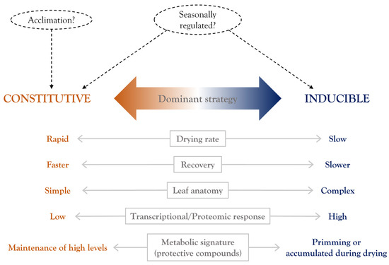 Overview of the intermediate vegetative desiccation tolerance strategy exhibited by pteridophytes. Desiccation-tolerant pteridophyte species can display a dominant strategy that is either constitutive (orange) or inducible (blue). A summary of the main characteristics and responses associated with each strategy are indicated. Some additional factors that can regulate desiccation tolerance capacity are indicated by discontinuous lines.