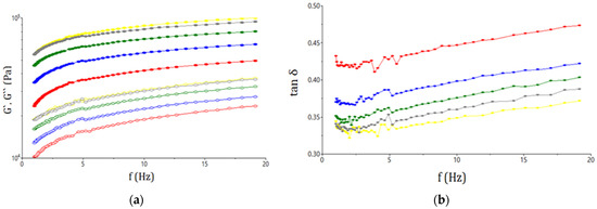 Evaluation with frequency of G′ (open symbols), G″ (solid symbols) (a) and tan δ (b) for the samples with different levels (-●-0%; -●-5%; -●-10%; -●-15%; -●-20%) of germinated chickpea flour additions.