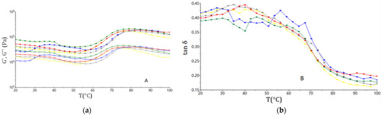 Evaluation with temperature of the G′ values (open symbols), G′′ (solid symbols) (a) and tan δ (b) for the samples with different levels (-●-0%; -●-5%; -●-10%; -●-15%; -●-20%) of germinated chickpea flour additions.