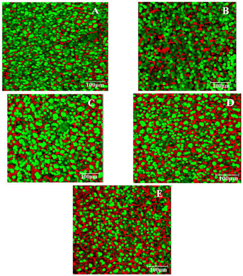 Microstructure taken by EFLM of wheat dough with germinated chickpea flour (GCF) at different levels: 0% (A), 5% (B), 10% (C), 15% (D), 20% (E). Red—protein; green—starch granules.