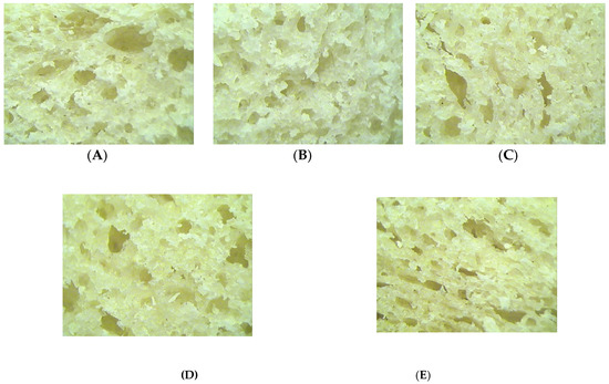 The crumb structure of the bread samples with different levels of GCF in the bread recipe are shown in Figure 4. As can be seen from the images obtained, the GCF addition led to a change in pore size and density. At low levels of GCF addition, the bread crumb presented larger pores, and at high GCF levels, GCF addition in the bread recipe let to a decrease in the pores’ density.