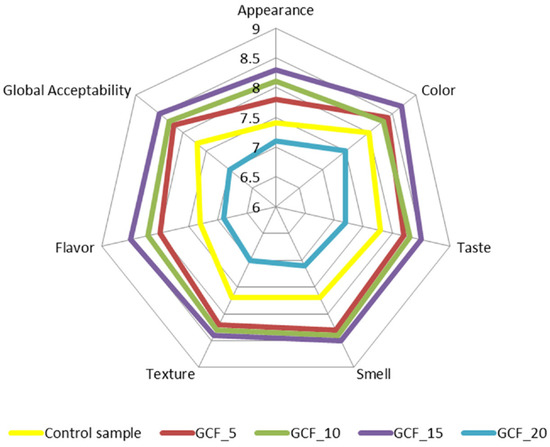 Figure 5 shows how the addition of GCF influenced consumer perceptions of the assessed organoleptic properties (appearance, color, taste, smell, texture, aroma and overall acceptability). From this figure, it can be seen that the GCF addition influenced each organoleptic property separately. Compared with the control sample, the sample with the addition of 15% GCF was the best appreciated by the participants in the tasting session, and the sample with the addition of 20% was the least appreciated. In view of these considerations, it can be stated that an addition of 15% is the optimal percentage for consumer satisfaction from a sensory point of view.