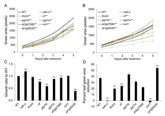 Total green area of the leaves in the Arabidopsis wildtype (WT) and mutant lines under the control conditions (A) and 75 mM NaCl stress (B). Relative growth rates of the Arabidopsis WT and mutant lines after five-day exposure to the control conditions (C) and 75 mM NaCl (D). ** represent highly significant differences in the means (p < 0.01), when compared to the WT using a t-test. Error bars show standard error and the experiment was performed with n = 48.