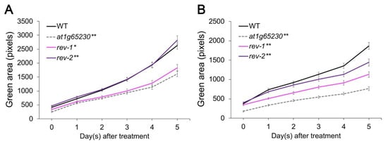 Total green area of the leaves in the Arabidopsis wildtype (WT) and revertant lines under the control conditions (A) and 75-mM NaCl stress (B). * represent the significant differences of the means (p < 0.05) compared to WT and ** represent the highly significant differences of the means (p < 0.01) compared to WT using a t-test. Error bars show standard error and the experiment was performed with n = 48.