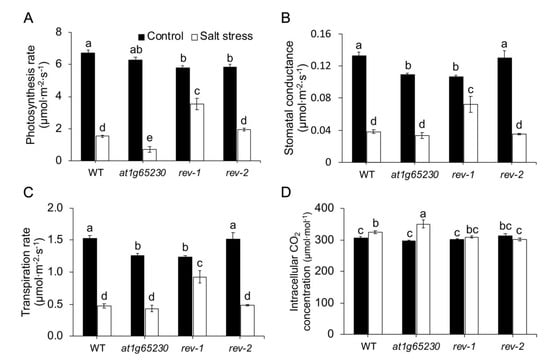 Photosynthetic parameters of the Arabidopsis wildtype (WT), at1g65230 mutant, and revertant line (rev-1 and rev-2) cultured under control (black bars) and salt-stress (white bars) conditions. Photosynthetic rate (Pn) (A), stomatal conductance (gs) (B), transpiration rate (E) (C), and intracellular CO2 concentration (Ci) (D) were determined after 10 days of treatments. The different letters above the bars represent the significant difference among means (p < 0.05). Error bars show the standard error of 3 replicates.