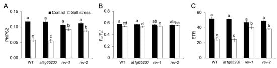 Efficiency of the light reaction in the Arabidopsis wildtype (WT), at1g65230 mutant, and revertant line (rev-1 and rev-2) determined after 10 days of treatment under control and salt stress conditions. Operating efficiency of PSII (A), excitation capture efficiency (B), and electron transport rate (C). The different letters above the bars represent the significant difference among means (p < 0.05). Error bars show the standard error of 3 replicates.