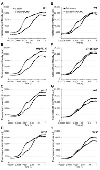 Salt stress had no effect on F0 and FJ of all lines, but it increased FM in WT and the mutant lines (Figure 5E,F); furthermore, lower FM was found in rev-1 (Figure 5G) and no effect on FM was found in rev-2 (Figure 5H). When salt-stressed plants were treated with DCMU, F0 was consistent with F0 of non-DCMU-treated ones in all lines. The FJ of WT and the mutant were increased (Figure 5E,F), but were lower than the FJ of the DCMU treated (FJ, DCMU) plants grown in normal conditions (Figure 5A,B). In contrast, DCMU did not affect the FJ of the revertant lines under salt stress conditions (Figure 5G,H). DCMU had no significant effect on FM of WT and the mutant line under salt stress, while the lower FM was found in the DCMU treated (FM, DCMU) revertant lines under salt stress conditions (Figure 5G,H).