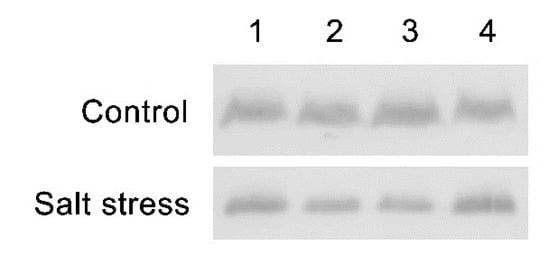 The seeds of all the Arabidopsis lines were sterilized, placed on square plates, and kept undisturbed in a refrigerator for four days. The square plates were then placed in a growth chamber for germination at 22 °C/20 °C, 16/8 h light/dark cycle, 120 µmol photons of photosynthetically active radiation (PAR) m−2·s−1, and 60% humidity. After four days of germination, the seedlings were transferred to 48-well plates containing full Murashige and Skoog (MS) solid medium (control) or MS solid medium supplemented with 75 mM sodium chloride (salt stress) and grown under the same condition. The green areas of the leaves were estimated every day using a PlantScreen XYZ system (Photon Systems Instruments, Drásov, Czech Republic) [].