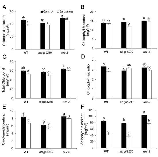 Pigment contents in the Arabidopsis wildtype (WT), at1g65230 mutant, and revertant line (rev-2) determined after five days of culturing under control and salt-stress (200 mM NaCl) conditions: Chlorophyll a (A), chlorophyll b (B), total chlorophyll (C), chlorophyll a/b ratio (D), carotenoids (E), and anthocyanin (F). The different letters above the bars represent the significant difference among means (p < 0.05). Error bars show SE of 4 replicates and each replicate was performed with 4 samples.