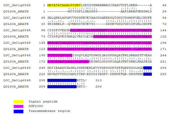 Amino acid sequence alignment of LOC_Os01g6845 and Q8L604, the protein product of at1g65230. Different motifs are indicated in yellow, pink, and blue. LOC_Os01g6845 sequence was obtained from the Rice Genome Annotation Project [] and that of Q8L604 was obtained from The Arabidopsis Information Resource [].