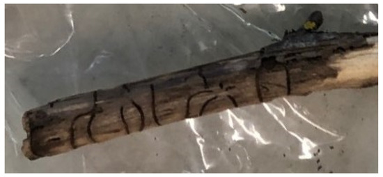 Following the first identification of a TCD outbreak in the province of Florence [10], a series of inspections were carried out, starting from April 2018, in a walnut plantation (mainly of J. nigra) aimed at studying GM and its vector PJ. A total of 24 branches (ca. 2–6 cm in diameter and 10–15 cm in length) were collected in September 2018 from six symptomatic plants according to [12]. Each sample was checked for the presence of PJ holes in the bark, as well as tunnels under the bark, by peeling off the branches. Small tissue pieces were sampled close to necroses and insect galleries from each collected branch (Figure 4). Part of this material was used for isolations, and the rest was employed for DNA extraction. Fungal isolation and morphological identification were carried out according to [16]. For molecular identification, DNA was extracted as described in Section 4.3 from pure fungal mycelium obtained from isolations, and the ITS1-5.8S-ITS2 rDNA region was amplified by PCR, using the universal primers for fungi ITS4 and ITS6 [34]. Following purification and sequencing of the amplicons, a BLAST search on GenBank revealed 99% identity of our isolate (GenBank accession number: MH620784) to North American and north Italian GM isolates.