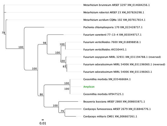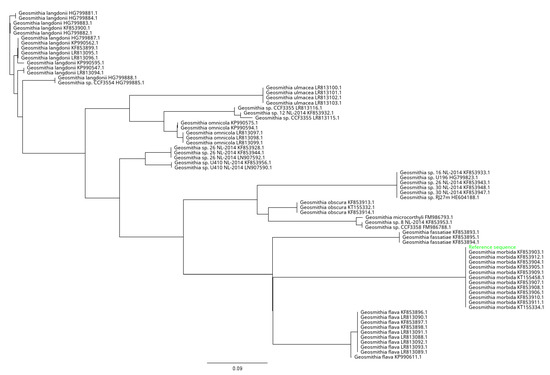 Unrooted phylogenetic tree from Genbank sequences from a portion of the kinesin gene of G. morbida isolates and related species for the LAMP protocol. The phylogenetic tree was constructed using Geneious 10.2.4 according to the neighbor-joining method and the Tamura–Nei model with 1000 bootstrap replicates. The Genbank accession numbers of each sample are indicated after the taxon name.
