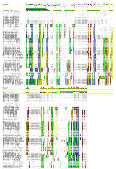 The SYBR Green qPCR primers were designed on the beta-tubulin gene (accession number KF853905; NCBI database) using OligoArchitectTM Primers and Probe Online software (Sigma-Aldrich, St. Louis, MO, USA), with the following specifications: a 100 to 380 bp product size; a Tm (melting temperature) of 55 to 65 °C; primer length from 16 to 28 bp; absence of secondary structure, when possible. All primers were provided by Eurofins Genomics (Ebersberg, Germany). Primer sequences are shown in Table 4. The specificity of the designed LAMP and SYBR Green qPCR primers (Table 4) was further tested using BLAST® (Basic Local Alignment Search Tool; http://www.ncbi.nlm.nih.gov/BLAST, accessed on 13 July 2021) [35] software. Moreover, to assess the in silico specificity of our primers, sequences with similarity to the GM LAMP and SYBR Green qPCR amplicons were retrieved from the GenBank database and aligned with the MAFFT software implemented in Geneious 10.2.6 [36], set with default parameters (Figure 5, Figure 6 and Figure 7). Unrooted phylogenetic trees from GenBank sequences of GM isolates and related species for the LAMP and SYBR Green qPCR protocols were constructed (Figure 6 and Figure 8, respectively) using Geneious 10.2.4 according to the neighbor-joining method and the Tamura–Nei model with 1000 bootstrap replicates.