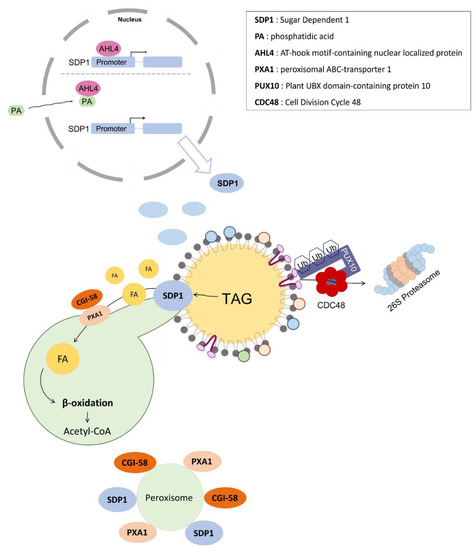 Although comparative gene identification-58 (CGI-58) is not a lipase, it plays a role as the co-activator of ATGL in mammalian cells [82]. Recessive mutations in the CGI-58 gene result in a genetic disease called Chanarin–Dorfman syndrome, which is correlated with a decrease in lipolytic events in multiple tissues [83]. Although little is known about lipases that are affected by CGI-58 in plants, the disruption of the Arabidopsis homolog of CGI-58 caused a dramatic increase in TAG levels and resulted in the accumulation of Chanarin–Dorfman-like LDs [76,84]. In Arabidopsis, CGI-58 is localized in the cytosol and on the surface of peroxisomal membranes, where it interacts with, and positively regulates, PXA1 activity in non-seed tissues, which consequently stimulates the transport of FAs into peroxisomes for their catabolism by β-oxidation [76].