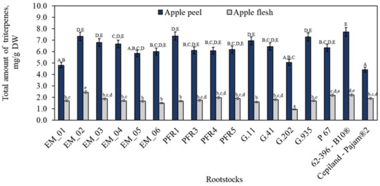 Our study was performed on the cultivar ‘Galaval’, which is one of the color mutations of the ‘Gala’ cultivar. The cultivar ‘Gala’ and its clones are widely planted and are some of the world’s top apple cultivars [39,40]. We found that depending on the rootstocks, the total amount of triterpene compounds in the ‘Galaval’ apple peel and flesh samples ranged from 4.41 ± 0.22 mg/g to 7.72 ± 0.39 mg/g and from 0.93 ± 0.05 mg/g to 2.43 ± 0.15 mg/g, respectively (Figure 1). The maximum total content of triterpene compounds (7.72 ± 0.39 mg/g) in apple peel samples was determined in fruit grown on the dwarf 62-396-B10® rootstock. The maximum total content of triterpene compounds (2.43 ± 0.15 mg/g) in apple flesh samples was found in fruit grown on the dwarf EM_02 rootstock. We found that the content of triterpene compounds accumulated in apple peel samples was 3.52–4.74 times higher than that accumulated in apple flesh samples. We found that depending on the rootstock, the content of triterpene compounds in apple peel samples moderately strongly and positively (r = 0.468, p <0.001) correlated with the content of these compounds in apple flesh samples. The results of our study confirm the studies which found that the peels of fruits were rich in triterpene compounds and the flesh of fruits contained some amount of triterpene compounds, but their concentrations were much lower than those in peels [41]. According to the data found in the scientific literature, the content of triterpene compounds in apple fruit is 0.28–0.34% of peel dry weight and 18.00–19.50% of peel wax extract [38].