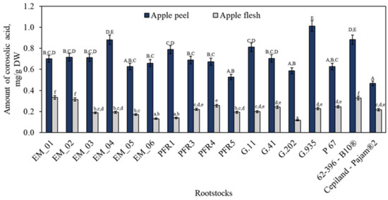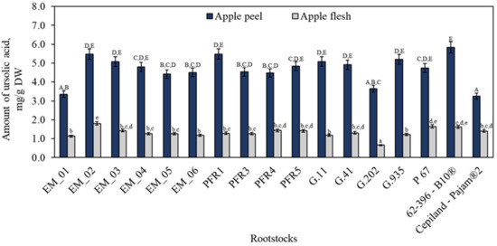 Apple peel functions as a protective barrier, and thus preserving the integrity and appearance of the peel is critical for market success. In apples, peel epidermal cells and the associated epicuticular wax are rich sources of secondary metabolites [42]. The following triterpene compounds were identified and quantified in the studied apple peel and flesh samples: ursolic, oleanolic, corosolic, and betulinic acids. Depending on the rootstock, the ursolic acid content in the apple peel samples ranged from 3.25 ± 0.16 mg/g to 5.84 ± 0.29 mg/g (Figure 2). The highest content of ursolic acid (5.84 ± 0.29 mg/g) was found in peel samples of apples grown on the dwarf rootstock 62-396-B10®. Meanwhile, the lowest amount of ursolic acid (3.25 ± 0.16 mg/g) was found in apple peel samples grown on the dwarf rootstock Cepiland-Pajam®2, which did not differ statistically significantly from the amounts found in peel samples of apples grown on the semi-dwarf rootstocks EM_01 or G.202. We found that the ursolic acid content in the apple flesh samples ranged from 0.65 ± 0.03 mg/g to 1.80 ± 0.09 mg/g and was 3.24–4.95 times lower than that found in the apple peel samples (Figure 2). The highest content of ursolic acid (1.80 ± 0.09 mg/g) in apple flesh samples was found in fruit grown on the dwarf rootstock EM_2, which did not differ statistically significantly from the amounts found in apple flesh samples in fruit grown on dwarf rootstocks P 67 or 62-396-B10®. The amount of ursolic acid in apples depends on the genotype of the cultivar. In our study, apple peel samples of the ‘Galaval’ cultivar were found to contain higher levels of ursolic acid compared to 0.14 mg/g found in apple peel samples of the ‘Brookfield Gala’ cultivar [43]. The amount of ursolic acid in 94 different apple cultivars grown in New Zealand ranged from 0.45 mg/g to 3.52 mg/g, reported by Andre et al. [7]. The apple samples of the ‘Aroma’ cultivar grown on the semi-dwarf rootstock MM.106 had higher levels of ursolic acid than the samples of apples grown on the dwarf rootstock M.9, according to the results of a study reported by Lv et al. [23]. We did not find any statistically significant differences in the amounts of ursolic acid between different rootstock growth groups or rootstocks of different origins.
