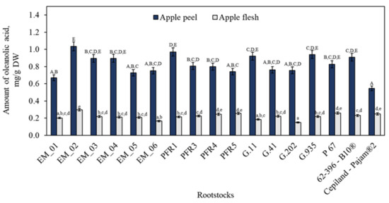 Ursolic acid is always accompanied by a minor amount (around one-fifth) of the isomeric oleanolic acid in apple peels [37]. Our study showed that the amount of oleanolic acid in the apple peel samples ranged from 0.55 ± 0.03 mg/g to 1.03 ± 0.05 mg/g, depending on the rootstock (Figure 3). The highest content of oleanolic acid (1.03 ± 0.05 mg/g) in apple peel samples was found in fruit grown on the dwarf rootstock EM_02, while the lowest content (0.55 ± 0.03 mg/g) was found in peel samples of apples grown on the dwarf rootstock Cepiland-Pajam®2. In apple flesh samples (as in apple peel samples), the highest content of oleanolic acid (0.30 ± 0.01 mg/g) was found in fruit grown on the dwarf rootstock EM_02, which did not differ statistically significantly from the amount of oleanolic acid detected in apple flesh samples in fruit grown on dwarf rootstocks G.41 or 62-396-B10® (Figure 3). Apple flesh samples in fruit grown on different rootstocks had 3.56 times lower oleanolic acid content compared to apple peel samples. The amount of oleanolic acid as well as that of ursolic acid depends on the genotype of the cultivar. Klein et al. found that the content of oleanolic acid (9.50 mg/g) in the waxy layer of the apple peel of the ‘Royal Gala’ cultivar was higher than that found in the waxy layer of the peel in fruit samples of ‘Granny Smith’, ‘Pink Lady’, or ‘Red Delicious’ cultivars [44]. The amount of oleanolic acid in apple peel samples varied from 0.05 mg/g to 0.84 mg/g, determined by Andre et al. [7]. According to the author, fruits which are characterized by a thicker opaque and waxy peel tended to have higher triterpene acid contents [7].