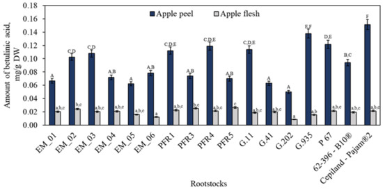 Betulinic acid content in apple peel and flesh samples was the lowest of all the identified and quantified triterpene compounds. The betulinic acid content in apple peel samples varied from 0.05 ± 0.003 mg/g to 0.15 ± 0.008 mg/g (Figure 5). The statistically significant highest content of betulinic acid (0.15 ± 0.008 mg/g) in apple peel samples was found in fruit grown on the dwarf rootstock Cepiland-Pajam®2. The highest amounts of betulinic acid (0.03 ± 0.001 mg/g) in apple flesh samples were found in fruit grown on rootstocks PFR3 and PFR5 (Figure 5). The betulinic acid content ranged from 0.09 mg/g to 0.14 mg/g in apple peel samples of the ‘Ligol’ cultivar grown on the rootstock P 60, reported by Kviklys et al. [31]. In our study, the amount of betulinic acid found in apple flesh samples of the fruit of the ‘Galaval’ cultivar grown on rootstocks corresponded to the content (0.003 mg/g) found in apple flesh samples of the ‘Brookfield Gala’ cultivar [43]. A study revealed a drastic variation among apple clones and concluded that the ‘Maxi Gala’ cultivar had the highest amount of betulinic acid [45].