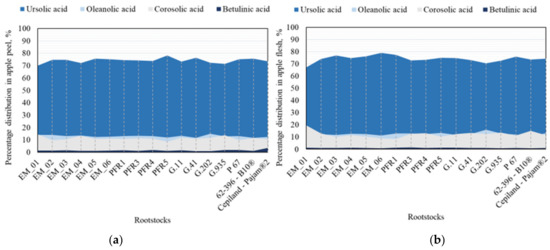 The amount of individual triterpene compounds in apple peel and flesh samples varied depending on the rootstock. In the apple peel samples, ursolic acid accounted for 70.04% to 78.33% of the total triterpene compounds (Figure 6a). Apple flesh samples showed a similar trend in the distribution of ursolic acid (from 67.10% to 79.11%) (Figure 6b). The percentage distribution of oleanolic acid in apple peel and flesh samples was significantly lower. We found that the amount of oleanolic acid ranged from 11.76% to 15.01% of total triterpene compounds in apple peel samples and from 10.52% to 16.11% in apple flesh samples (Figure 6). Depending on the rootstock, the percentage distribution of corosolic acid in apple peel and flesh samples was in some cases higher than that of oleanolic acid. Our study showed that the percentage distribution of corosolic acid in apple flesh samples of fruit grown on the rootstock EM_01 was 19.70% of the total amount of triterpene compounds (Figure 6b). In the apple samples, betulinic acid content accounted for the smallest percentage of the distribution. The study showed that depending on the rootstock, the content of betulinic acid in the apple peel samples could range from 0.98% to 3.43% of the total amount of triterpene compounds, and in the apple flesh samples, from 0.84% to 1.48% (Figure 6).
