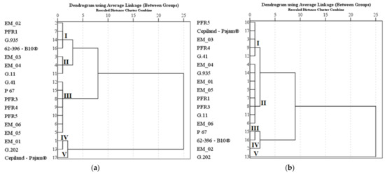 Influence of rootstocks on the quantitative composition of triterpene compounds: (a) the dendrogram illustrates variation in the quantitative composition of triterpene compounds in apple peel samples; (b) the dendrogram illustrates variation in the quantitative composition of triterpene compounds in apple flesh samples.