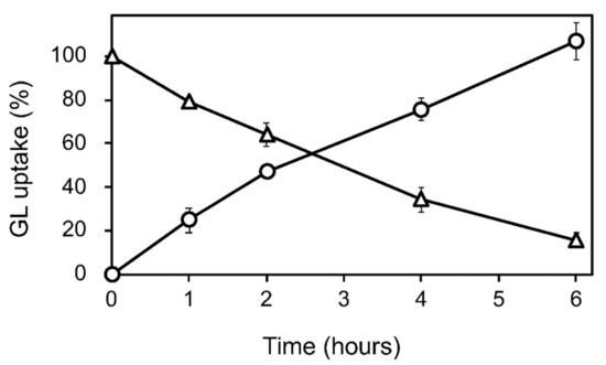 GL was added to the cell suspension cultures of G. glabra at the early growth phase (a week after subculture) at a final concentration of 100 µM. The GL concentration in the cell and medium was periodically determined for 6 h after GL addition. The loss of GL from the medium during incubation was considered the amount taken up by the cells (Figure 2 and Figure S1). GL was found to be stable in the medium without cells over a 6 h incubation period. GL uptake did not affect cell viability throughout the 24 h incubation period.