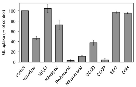 Cultured cells of G. glabra were incubated with inhibitors in 25 mL of LS medium for 1 h before adding GL. According to another study [37], the final concentration of the compounds and the solvents used to prepare the stock solution (given in parentheses) are as follows: 100 µM NAA (water), 200 µM nifedipine (DMSO), 10 mM NH4Cl (water), 100 µM GA (DMSO), 500 µM glucuronic acid (water), 2 mM sodium orthovanadate (water), 200 µM probenecid (DMSO), 50 µM niflumic acid (DMSO), 10 µM DCCD (DMSO), 10 µM CCCP (DMSO), 1 mM BSO (water), and 100 µM GSH (water). Sodium orthovanadate was depolymerized before use according to the method of Goodno [44]. To 25 mL of LS medium, 50–125 µL of the stock solution was added. For the control, the same amount of DMSO or water was added. After adding GL (final concentration 100 µM), uptake was measured at 25 °C for 6 h.