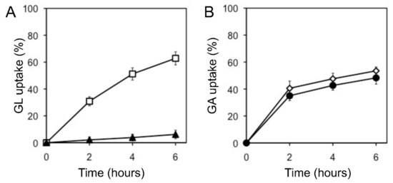 Effect of GA on GL uptake by cultured cells of G. glabra. (A) GL uptake was measured with (filled triangles) or without (open squares) GA. (B) GA uptake was measured with (filled circles) or without (open diamonds) GL. The final concentration of each compound was 100 µM. The value of 100% indicates the amounts of GL or GA added to the medium at 0 h. Data are presented as the mean ± standard deviation from triplicate cultures.