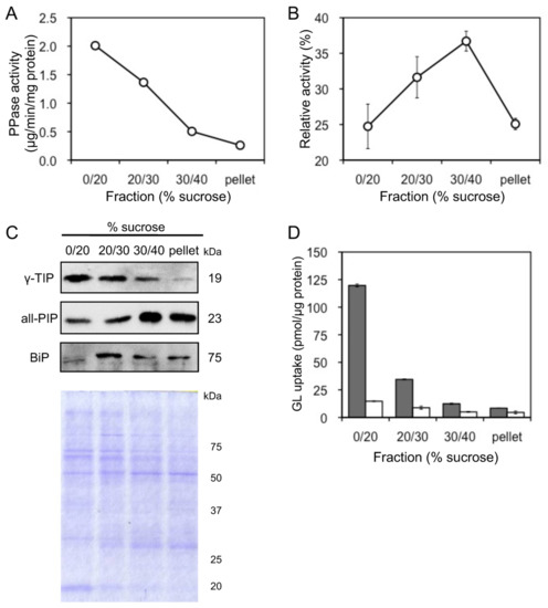 Tonoplast vesicles were purified by sucrose density gradient centrifuge of microsomes prepared from cultured cells of G. glabra. Due to their activities, vanadate-sensitive ATPase and PPase were used as marker enzymes for plasma membrane and tonoplast vesicles, respectively. Tonoplast-rich vesicles were recovered from the interface between 0% and 20% sucrose layers (0–20% sucrose fraction), while plasma membrane-rich vesicles were recovered from the 30–40% sucrose fraction (Figure 5A,B). Membrane separation was confirmed by immunoblot analysis using antibodies against the luminal binding protein (BiP), all plasma membrane intrinsic proteins (all-PIP), and γ-tonoplast intrinsic protein (γ-TIP), which are marker proteins for the endoplasmic reticulum (ER), plasma membrane, and tonoplast, respectively (Figure 5C). GL uptake was the highest of the tonoplast-rich vesicles recovered from the 0–20% sucrose fraction (Figure 5D). Furthermore, GL transport was strictly dependent on MgATP and was not observed in its absence. The extent of GL uptake in the four fractions was consistent with γ-TIP levels in the fractions.