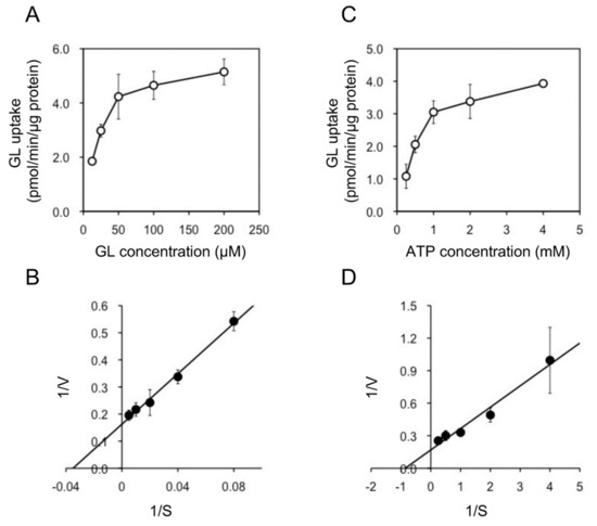 Kinetic analysis of ATP-dependent GL transport by tonoplast vesicles. (A) Tonoplast vesicles were incubated with various concentrations of GL in the presence of 5 mM MgATP. (B) Lineweaver–Burk plot of the concentration dependence of GL transport. (C) Tonoplast vesicles were incubated with 100 µM GL and various concentrations of MgATP. (D) Lineweaver–Burk plot of ATP-dependent GL transport. Data are presented as the mean ± standard deviation from triplicate cultures.
