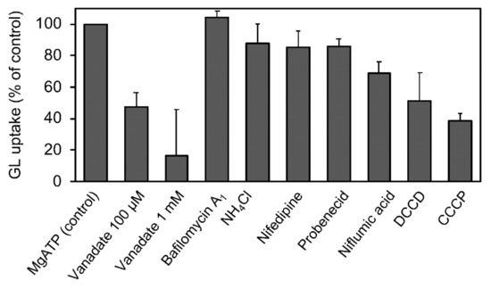 We estimated the effects of various transport inhibitors on GL transport by tonoplast vesicles (Figure 9). Vanadate effectively suppressed GL uptake. CCCP, DCCP, and niflumic acid moderately inhibited the transport. However, bafilomycin A1, NH4Cl, and probenecid hardly inhibited GL transport.