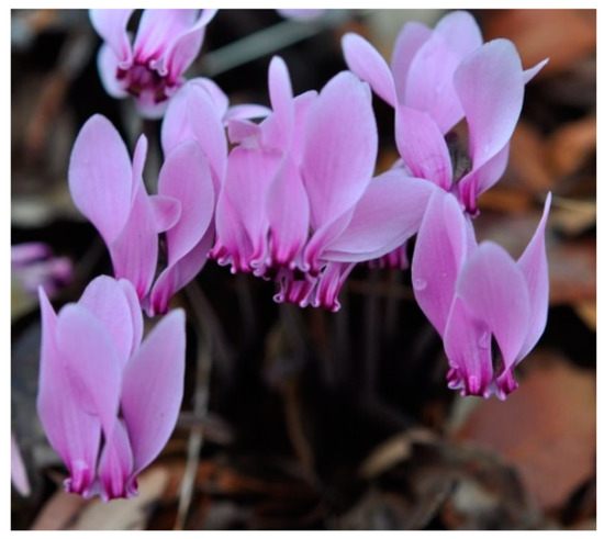 - The Cyclamen Society. Available online: https://www.cyclamen.org/plants/species/ (accessed on 7 April 2022).