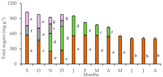 Sugar content in tubers (brown bars), leaves (green bars), pedicels (gray bars), and petals (purple bars) of Cyclamen graecum, from September (S) to August (A). Each column denotes means of five replicates ± standard error. Standard Errors smaller than the line thickness of the columns are not shown. Significant differences (p < 0.05) of mean values are marked using lowercase letters.