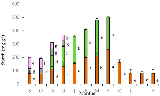 Starch content in tubers (brown bars), leaves (green bars), pedicels (gray bars), and petals (purple bars) of Cyclamen graecum, from September (S) to August (A). Each column denotes means of five replicates ± standard error; Standard Errors smaller than the line thickness of the columns are not shown. Significant differences (p < 0.05) of mean values are marked using lowercase letters.