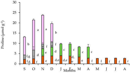 Proline content in tubers (brown bars), leaves (green bars), pedicels (gray bars), and petals (purple bars) of Cyclamen graecum, from September (S) to August (A). Each column denotes means of five replicates ± standard error; Standard Errors smaller than the line thickness of the columns are not shown. Significant differences (p < 0.05) of mean values are marked using lowercase letters.