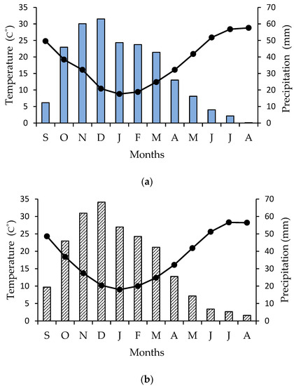 (a) Ombrothermic diagram (Precipitation scale = 2 × Temperature scale) for the study site; the order to months is from September (S) of 2018 to August (A) of 2019. Mean monthly precipitation is indicated by blue bars and mean monthly temperature by closed circles and the black line; (b) A multiannual ombrothermic diagram (Precipitation scale = 2 × Temperature scale) for the study site from September of 1955 to August of 2010; the order to months is from September (S) to August (A). Mean monthly precipitation is indicated by shaded bars, and mean monthly temperature by closed circles and the black line.