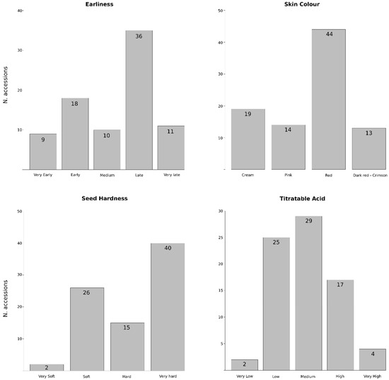 Phenotypic variation of the 94 pomegranate accessions for harvest period and three fruit quality traits (skin colour, seed hardness and titratable acid content). Number of accessions of each type is indicated.