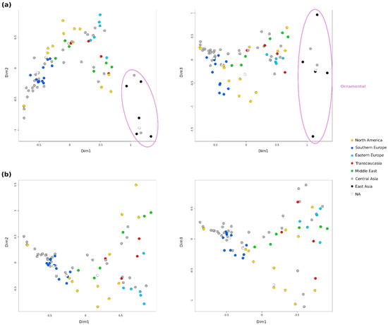 Relationships between accessions and population structure were explored using different approaches. First, several Factorial Correspondence Analysis (FCAs) were conducted to explore the patterns of variation in the collection (Figure 2 and Figure S1). For clarity purposes, the coordinates of each accession in each FCA can be checked in Table S3. In general, some grouping according to the broad geographical regions was observed. The accessions from Central Asia, the main number, appeared distributed throughout the graphs. However, two groups were observed within the accessions from North America and also from the Middle East. A clear separation was also observed between samples from Southern and Eastern Europe. The FCA including all 85 accessions, after removing the nine potential redundancies, explained 26.7% of the variability by the first 3 dimensions and showed the ‘Elx-13’ accession (No. 27) clearly separated from the rest by the third dimension (Figure S1). This accession is a seedling from India, the only one in this analysis coming from South Asia. Accordingly, a new FCA was performed without this accession (Figure 2a). In this case, the accessions appear more distributed and the first 3 dimensions explained the 26.81% of the variability. Ornamental accessions appeared grouped and separated from the rest by the first dimension. This group of 8 accessions included the 5 from East Asia (all Japanese), 2 from Central Asia (No. 24 and 91) and 1 of unknown origin (No. 41). Close to them, in the central part of the first graph, appeared one group from North America (No. 19, 25 and 55) and another from the Middle East (No. 5, 23 and 87), jointly with some accessions from Central Asia (No. 42, 71, 77 and 94), Transcaucasia (No. 9 and 43) and Eastern Europe (No. 6). Finally, third dimension clearly separated the Japanese ornamentals ‘Ki-Zakuro’ (No. 50) and ‘Nochi shibori’ (No. 65), but also in a more subtle way other 5 accessions from North America (No. 7, 37, 38, 53, 69) and 5 from Southern Europe (No. 26, 29, 30, 31, 60).