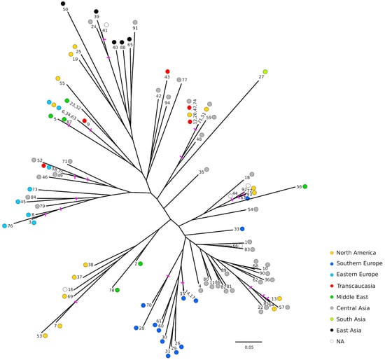 As a second approach to explore the relationships between the accessions, a Neighbor-Joining tree was built using Bruvo’s distance [22] (Figure 3). Bootstrap supports were quite low overall, with values greater than 50 only on some outer nodes. In general, similar geographical grouping to those of the FCAs was observed. Ornamental accessions appeared also grouped, while Southern and Eastern European accessions appeared separated in two groups as observed before in the FCAs. It should be noted that among the Southern European accessions, all the Spanish ones appeared clearly grouped and close to a group of accessions from Central Asia. Similarly, the accessions from Eastern Europe appeared close to each other but in this case also intermingled with some materials from Central Asia. Regarding the accessions of unknown origin, in some cases it seems that their origins could be inferred. For instance, ‘Cana’ (No. 16) appeared clearly grouped with some accessions from North America, although according to the name it could be from the Middle East. Also, ‘Orange’ (No. 66) grouped with some from Central Asia, and ‘How Sweet It Is’ (No. 41) appeared grouped with the ornamental ones. Contrary, ‘Ink’ (No. 44) and ‘Wonderful-1’ (No. 92) appeared grouped with some accessions from different regions such as Central Asia (‘Chandyr’ (No. 18)), North America (‘Purple Heart’ (No. 72) and ‘Wonderful-2’ (No. 93)), Southern Europe (‘Palermo’ (No. 67)) and Middle East (‘Mahali Dezful’ (No. 56)).