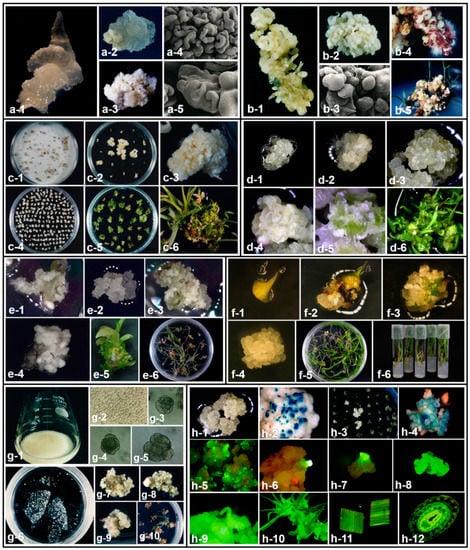 The authors have established tissue culture systems for several warm-season grasses, from callus induction to plant regeneration. Embryogenic callus was initiated from immature embryos on MS medium supplemented with 10 mg L−1 2,4-D, 10% coconut water and solidified with 0.8% agar in Guinea grass (Panicum maximum) (Figure 1a). Initially various types of calli were obtained and embryogenic responses were found to be correlated with the genotypes investigated. For somatic embryo germination and plant formation, MS medium supplemented with gibberellic acid and kinetin were used. The twelve genotypes analyzed can be classified into three groups by the frequency of somatic embryo formation and degree of apomixis. One of the groups consisted of highly apomictic genotypes with a high embryogenic capacity [40]. Plant regeneration from cultured immature inflorescences of dallisgrass (Paspalum dilatatum) was obtained by somatic embryogenesis (Figure 1b). Embryogenic callus was initiated from immature inflorescences on MS medium supplemented with 2, 5, and 10 mg L−1 2,4-D and solidified with 0.2% Gellan Gum. Somatic embryos developed and germinated precociously when embryogenic calli were transferred to a medium containing kinetin and gibberellic acid. All regenerants were successfully grown to maturity [47]. In bahiagrass, embryogenic callus was initiated from mature seeds on MS liquid and solid medium supplemented with 2 mg L−1 2,4-D with a two-step callus induction method (Figure 1c). Selection of high-quality callus from a large number of mature seeds could be obtained by this modified culture. In addition, the selected good quality callus was cultured in MS medium with 2 mg L−1 2,4-D, 0.1 mg L−1 BAP and 50 μM CuSO4, which resulted in dense pro-embryos on the surface of the callus and maintained high potential regeneration capacity for long-time culture (Figure 1d) [89].