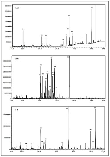 GC-chromatograms of the essential oils obtained from (A): J. intigrimma, (B): J. gossypifolia and (C): J. roseae leaves using the Rtx-5MS column.